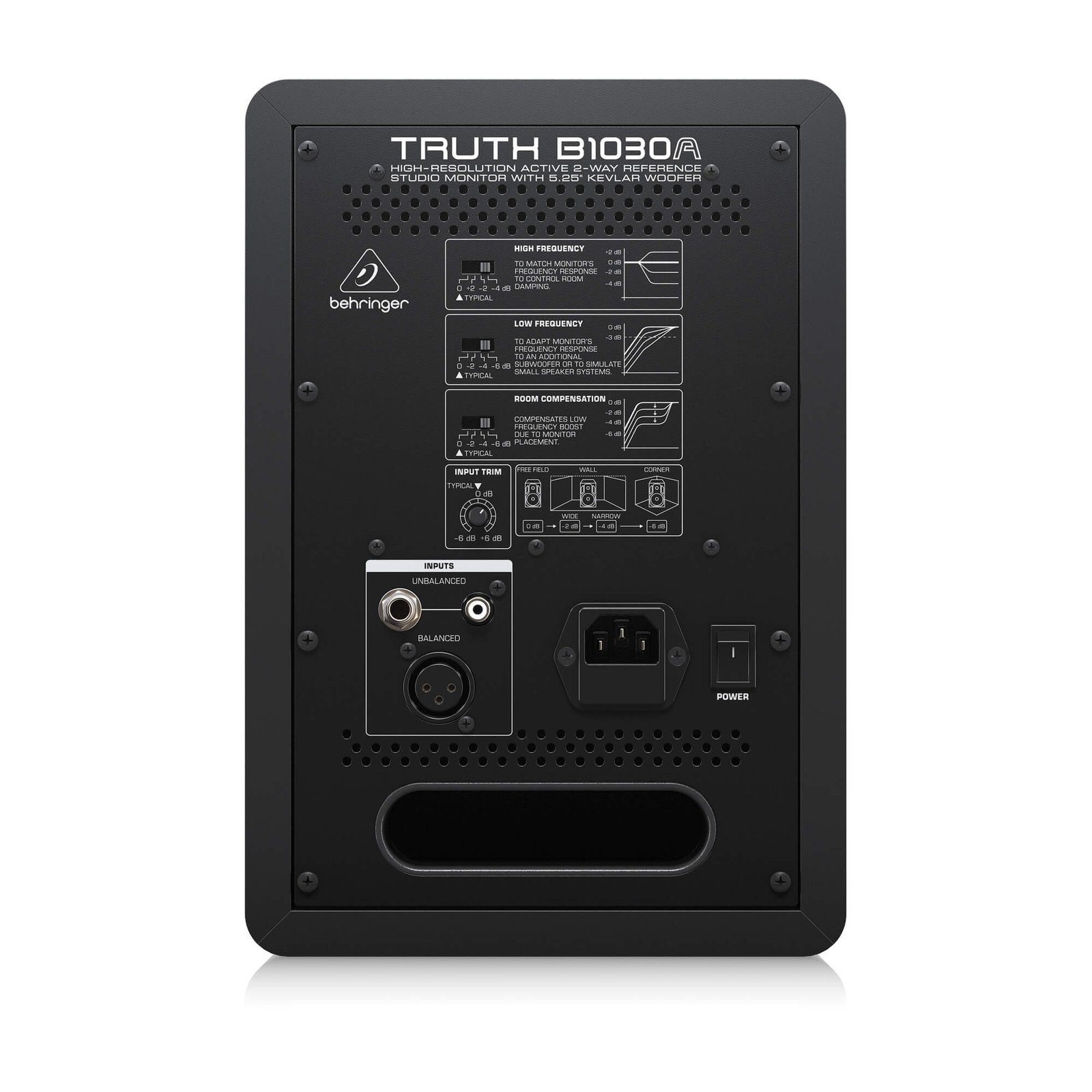 The ideal environment for listening is a room that is “flat,” neither too reflective (echoes) nor too absorptive (where the sound is muffled). But since all rooms are not the same acoustically, your TRUTH B1030A comes equipped to function in a wide variety of environments. Rear panel filter switches are provided to adapt the monitor’s low- and high-frequency characteristics for optimal performance – specifically for your listening environment. Monitor placement is also critical. Ideally, all loudspeakers should be placed away from walls to ensure proper bass response. The B1030A features a set of Room Compensation switches so you can place it against walls, or even in corners. Walls tend to enhance low-frequency content, and corners exaggerate bass even more, but your TRUTH B1030A can be custom-tailored to provide honest bass response for your situation, with the simple flick of a switch or two.