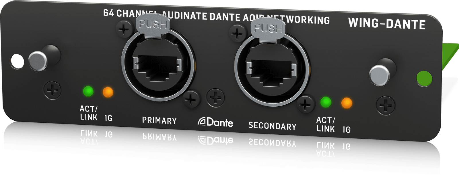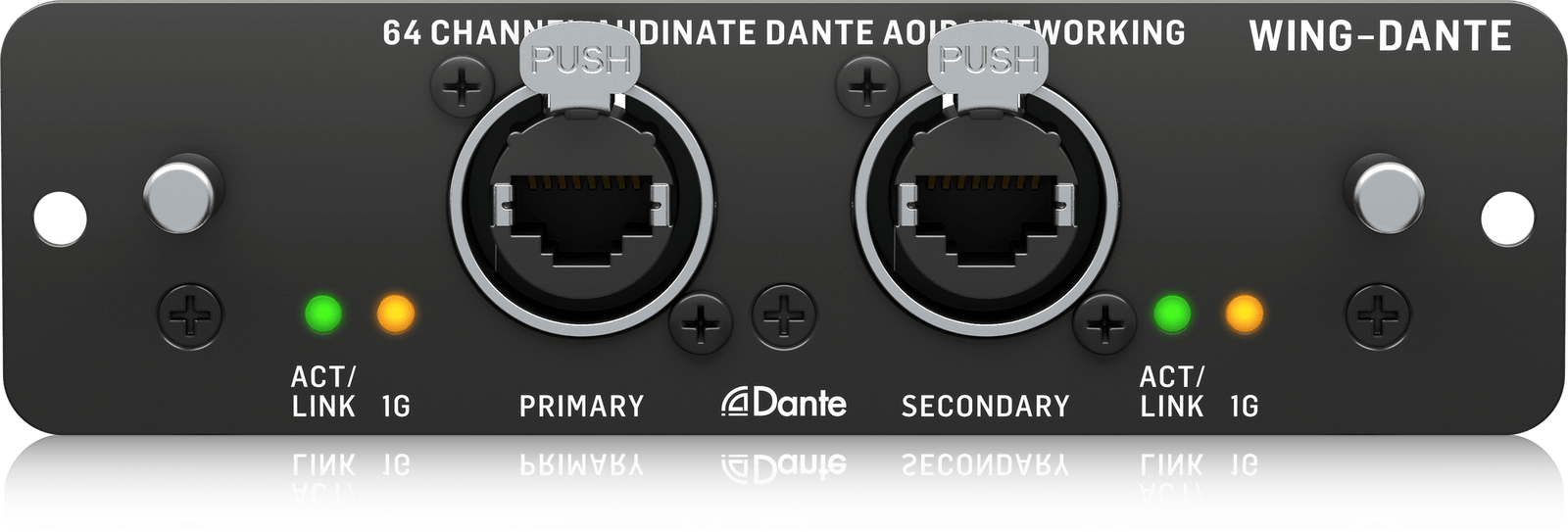 The 64-channel 48 kHz bi-directional audio interface brings even more I/O options to the WING by making it ready for integration with Dante enabled IP networks. Dante is a proprietary AoIP solution from Audinate, which also complies with the AES67 standard for improved interoperability. It uses either standard 100Mbit/s or Gigabit Network infrastructure with DSCP-based QoS, with support for mixed sample and bit rates coexisting on the same network. The WING-DANTE card utilizes 24-bit signal transmission with sample-accurate synchronization and low latency, ensuring the highest audio integrity. Its secondary input allows you to set up a seamless, redundant network access.