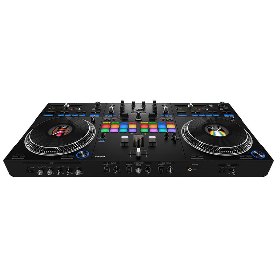The DDJ-REV7 is solid and robust, yet still lightweight enough to grab by the handles on the chassis and carry to your next gig. Contrasting matte and hairline finishing in different sections of the aluminum top plate create distinction between the deck and mixer sections, so the layout looks like a traditional 2 x turntable + mixer setup, while the On Jog Displays mimic the label in the center of a vinyl record.
