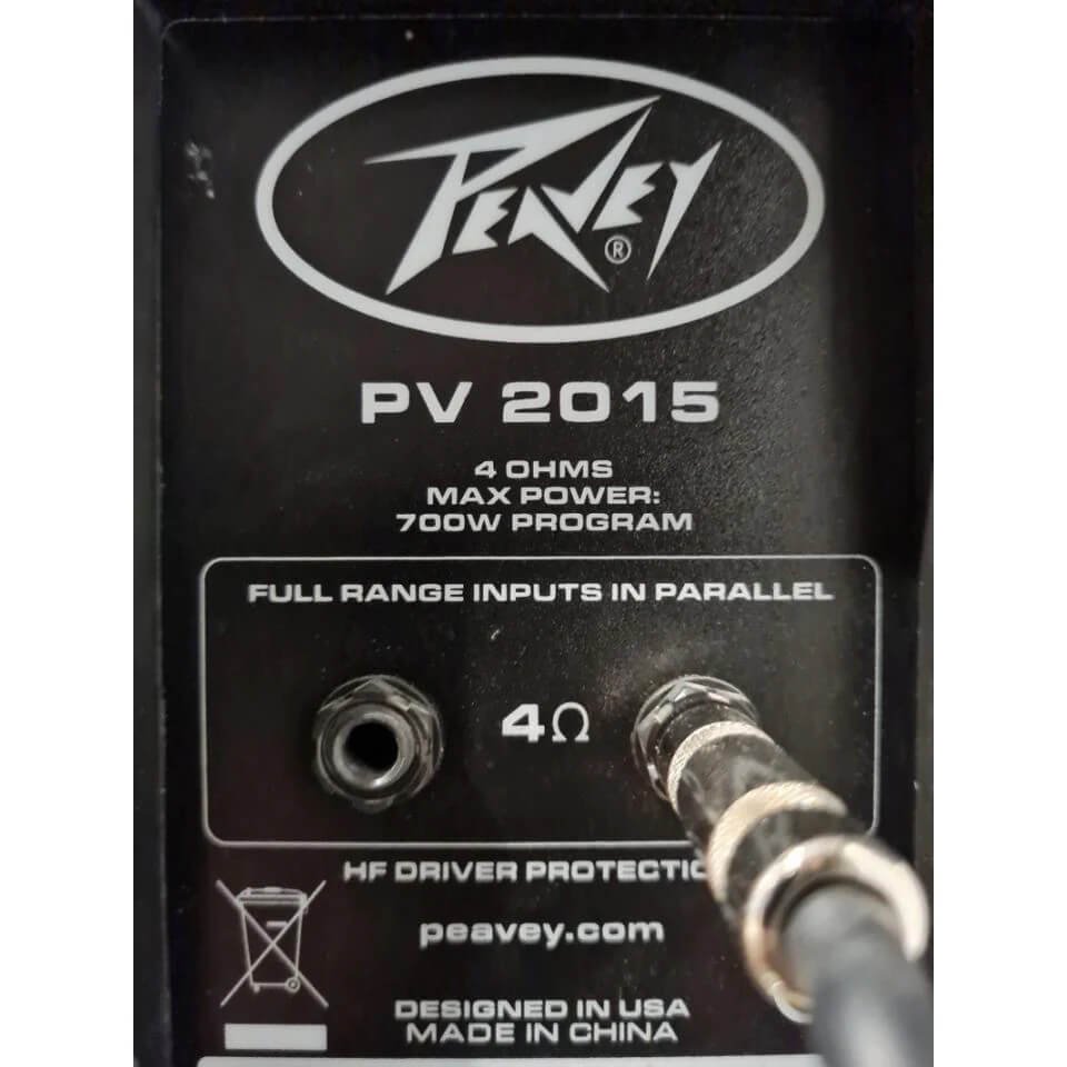 The PV 2015 is a full range quasi-three-way speaker system utilizing a pair of 15″ premium woofers and a RX14 titanium diaphragm dynamic compression driver for the highs. This high performance driver is mounted on a Peavey asymmetric Quadratic Throat Waveguide, with smooth, even response, low distortion and good high frequency dispersion. This horn has an asymmetrical vertical polar response, aiming the main energy lobe down 10(o), so it is aimed at the audience, instead of over their heads. This helps reduce ceiling reflections for greater clarity and gain before feedback. The constant directivity characteristics provide the even coverage needed for a successful sound reinforcement application.