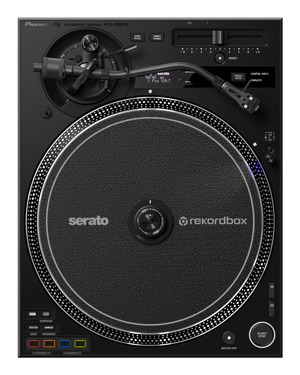 The PLX-CRSS12 inherits classic turntable layout elements, but a new addition is the 4 built-in MIDI-mappable Performance Pads which put your favorite features at your fingertips. They’re right where you need them – just below the platter – so you can fire off Hot Cues and samples quicker than ever, which comes in handy even more if you’re performing on a mixer that has no pads. There’s native support for various pad modes (see below), and a dedicated button enables you to switch control from pads 1-4 to 5-8. The pads are MIDI mappable too, so you can assign them to other features.